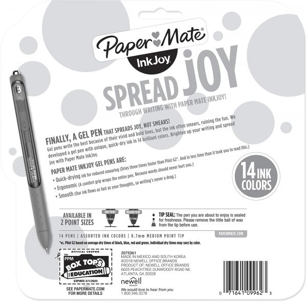 Spread joy (not smears) with Paper Mate InkJoy gel pens. With vivid gel ink that dries 3x faster, for reduced smearing, its like a party on the page where smudges arent invited. Brilliant colors ensure that your writing will be bright and filled with fun. Fully wrapped in a comfort grip, these gel pens have a smooth style that keeps the joy flowing as fast as your thoughts. Individual ink drying times may vary by color.