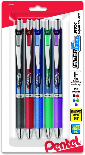 Pentel EnerGel RTX Retractable Liquid Gel Pen, 0.5mm, Metal Tip, Assorted Ink, Pack of 5 (BLN75BP5M)