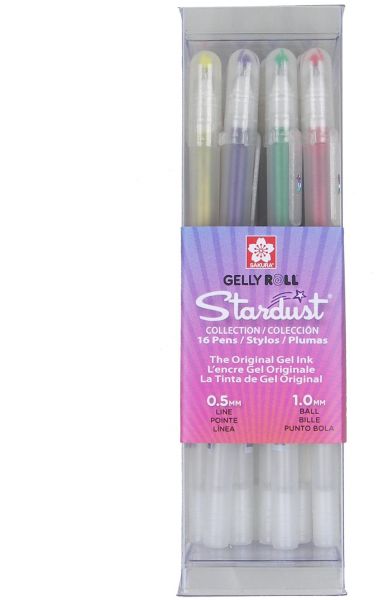 Gelly Roll Stardust 16 piece gel pen Cube Collection contains 2 each: Red-Star, Pink-Star, Purple-Star, Silver-Star, 1 each: Golden-Star, Copper-Star, Rose-Star, Sky-Star, Lime-Star, Green-Star, Blue-Star, and Marine-Star. Packaged in a sturdy, reusable cube container.