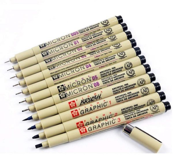 · Minute details and preservation count, the unparalleled archival quality of pigma micron pens makes them everyone's first choice. Artist, writers and illustrators reach for pigma micron and know their work is safeguarded with the permanence of pigma ink. Experience smooth, skipfree writing and crisp ink colors that leave consistent lettering and lines every time. It has achieved universal appeal and is carried by technical professionals, artists and crafters alike anthropologists, entomologists, scientists, research laboratories, archivists, architects, professional diamond cutters, cartoonists, manga and anime artists, illustrators, heirloom quilters and decorative fabric artists. Features archival quality ink for use in acidfree environments, chemically stable, waterproof, fade resistant, no smears, feathers or bleedthrough on most papers. Applicable for graphic art, scrapbook, archival recording, pen and ink illustrations, freehand art, rubber stamps, cartooning and fabric design. Technical qualities are archival quality pigma ink, six point sizes, no smear or feather when dry, waterproof and chemical proof, fade resistant, does not bleed through most papers, meets astm and acmi nontoxicity standard and not evaluated for cosmetic use on skin. Set contains 9 different pieces having nib sizes for precise line width are 0.20mm, 0.25mm, 0.30mm, 0.35mm, 0.4mm, 0.45mm 0.50mm 1.0mm, 2.0mm, 3.0mm and 0.8-2.5mm(BR) respectively. Available in 11piece per pack and black color.