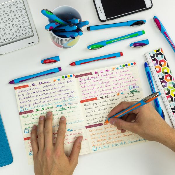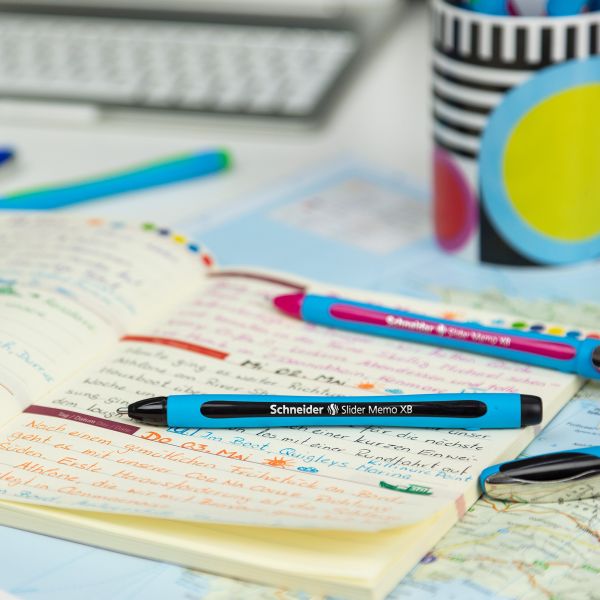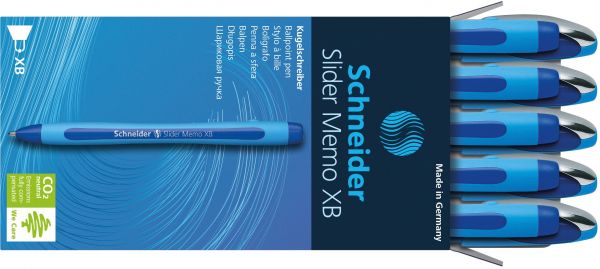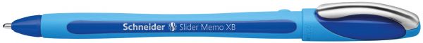 Gear up for a successful day in the office or the classroom with the Slider Memo XB pens. Designed with Visoglide(R) ink technology, these Schneider pens produce smooth, quick-drying marks, so you can record essential information without worrying over distracting smears. Visoglide(R) ink technology glides easily over paper and dries fast and does not smear when highlighted. An ergonomic shape and rubberized grip helps prevent hand fatigue. Extra wide, stainless steel tip is wear resistant and delivers clean writing to the end. This pen provides a large ink reservoir and a thick, sold metal clip on the removable cap. Includes a pack of 10 extra-bold-point pens with blue ink and barrels.