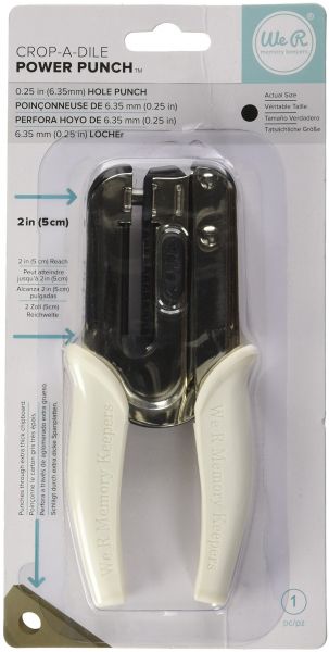 Easily punch holes in paper, extra-thick chipboard, fabric, thin tin, plastic, and more! This punch features a 2" reach from the edge of the material, a lock for keeping the tool closed with not in use, and a waste receptacle that holds the cut pieces until you are ready to empty them. It has the strength of a Crop-A-Dile, and soft silicone grips on the handles provide comfort and style. This package contains 1 Power Punch tool. The punched hole has a diameter of 1/4" while the tool itself measures 2-3/4" x 6-1/4" x 7/8".