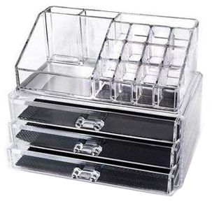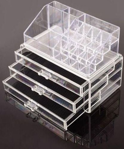 This acrylic jewelry and makeup 3 drawer organizer is perfect for organizing lip liners, eyeliners, makeup, lip glosses and jewelry and more . It's a space saving accessory that keeps your makeup neat and organized. Regarding acrylic : acrylic is a useful, clear plastic that resembles glass. But it has properties that make it superior to glass in many ways. It is many times stronger than glass, making it much more impact resistant and therefore safer. Acrylic also insulates better than glass, potentially saving on heating bills. Adding to this favorable array of properties, a transparency rate of 93% makes acrylic the clearest material known. Very thick glass will have a green tint, while acrylic remains clear.