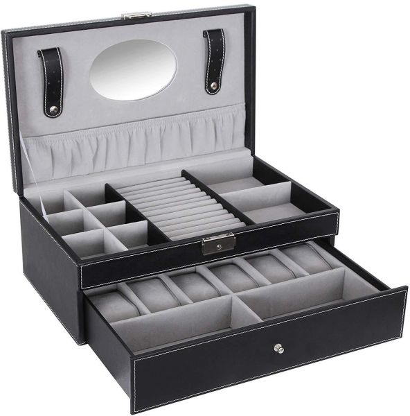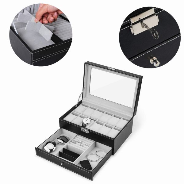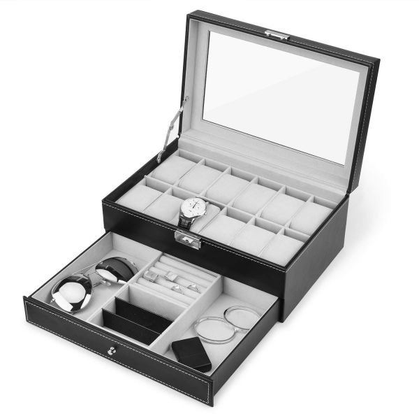 - [Multi-functional Compartment] --- 12 watches with 12 removable velvet pillows, 1 ring case, 2 stud earring cards, 5 more compartments for necklaces, bracelets, cufflinks, cuff links, spare links, earrings, brooches and other jewelrys.