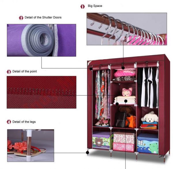 Wardrobe with ClosetsDurable fabric coverFirm exquisite steel piping frameCan be easily dismantledLarge full hanging spacePreserving your clothes from insect biting, dust and humidity