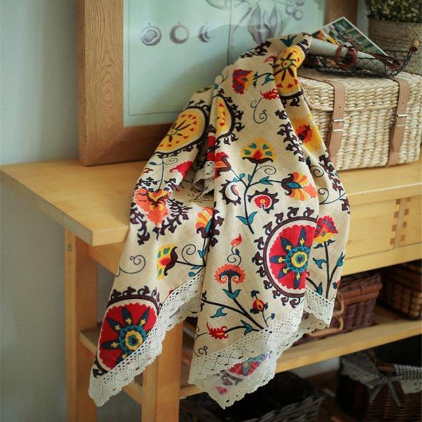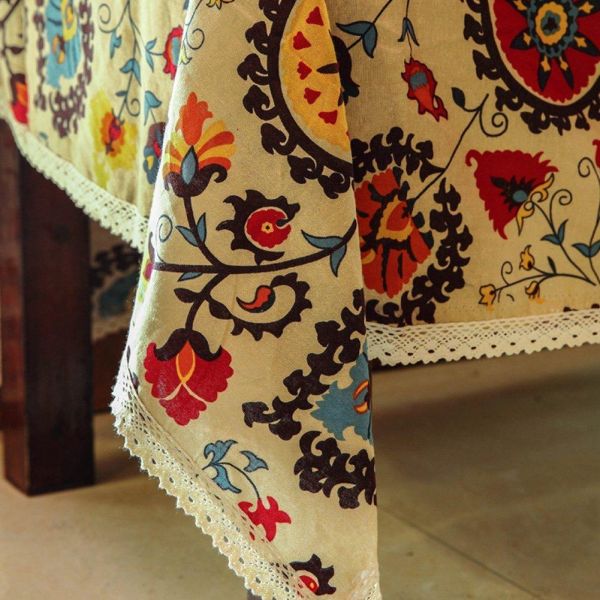 描述:Vintage Square Cotton Linen Lace Sun Flower Tablecloth, Washable Dinner Home Decoration Assorted Size
