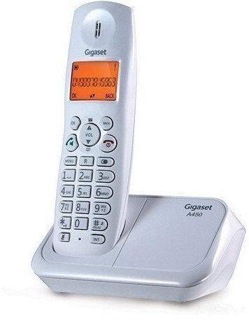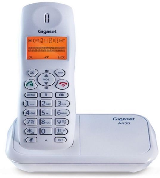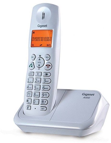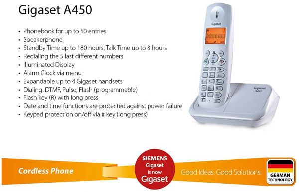 Gigaset telephone offers an 8 hours talk time and 180 hours of standby time. This Gigaset Cordless can save 50 contacts in its phonebook.Suitable for both personal and official purposes, this Gigaset A450 White Cordless Telephone delivers an incredible performance. The speakerphone lets you enjoy convenient hands-free calls. It is equipped with a backlight display that allows you to read the numbers accurately even when it’s dark. It has a caller display that adds to your convenience. It can store up to 50 names and numbers in the phonebook. The cordless phone provides 8 hours of talk time and 180 hours of standby time. It has 10 built-in ringtones so you can select the one you like the most.
