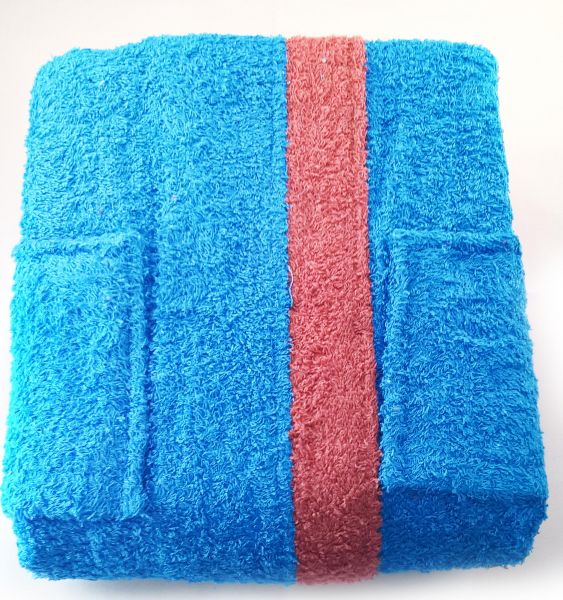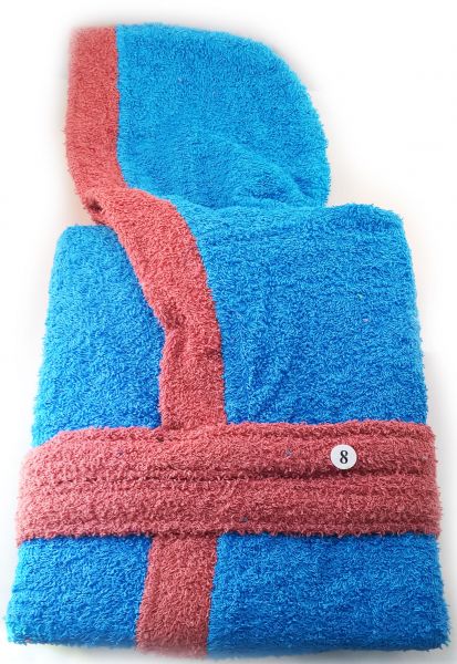 描述:bathrobe for kids made out of cotton with Light blue color front side two pockets and belt