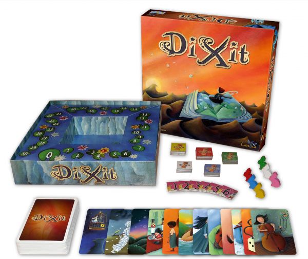 One player is the storyteller for the turn and looks at the images on the 6 cards in her hand. From one of these, she makes up a sentence and says it out loud (without showing the card to the other players).