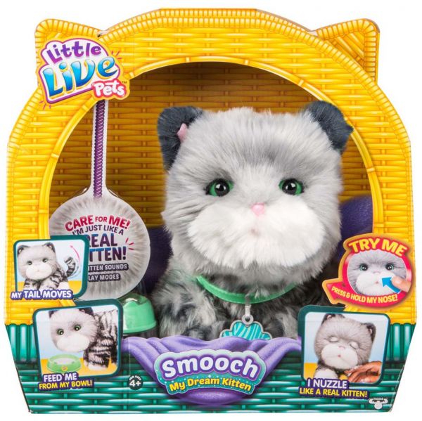Say hello to Smooch - My Dream Kitten! The adorable Little Live Pet who moves and acts just like a real kitten! I purr when I'm happy. Scratch my cheek and I'll cuddle you! My tail moves just like a real kitten. I come with my own adoption certificate. With a pat of the back or a touch of the cheek, this little kitten behaves in different ways! Fully interactive, it is the “Purrrfect” pet that can’t wait to come home with you!