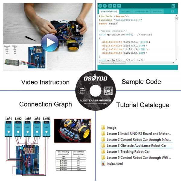 2. Step-By-Step tutorial with sample code, picture & video: CD instructions with a step-by-step tutorial which evolves from a simple car without any control to a multi-function robotic car controlled by mobile APP. Tutorial has 5 lessons which include detailed sample code with comments, circuit graph, assembly instruction and video. Even if you have no programming experience, you can follow the step-by-step instruction and gradually become a master.