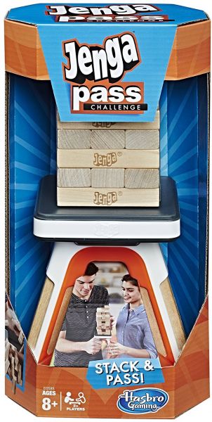 Take gameplay 'off the table' with the Jenga Pass Challenge game. Stack Jenga wooden blocks on the platform to build the tower. Players then take turns removing one block at a time while holding one of the platform handles. After each player takes a turn, they pass the tower to their opponent. Be the last player to successfully stack a block and pass the platform without causing the tower to crash to win.