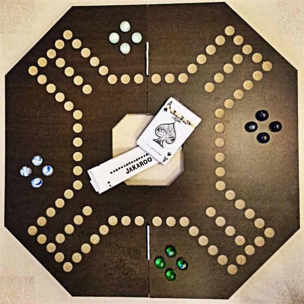 描述:The wooden hollowed board (45 X 45cm) and 16 plastic pawns (4 for each player) and one set of Playing cards (52 cards) are the parts of this game, and this game is called JAKAROO