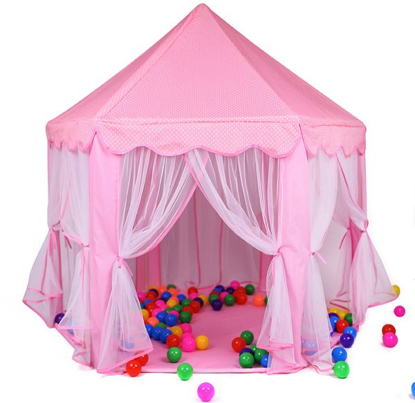Material of Play Tent: Made of soft fabric and breathable mesh design allows for a safe and environmental friendly playhouse for the kids, t ent door can be positioned wherever you need, simply tie the curtain back to create the door. Kids can crawl in and out easily.Fairly easy to install with support poles,then knot the ends of the elastic inside the poles. Kids Tent Dimension in inch: Tent 56" (Diameter) x 54" (H), especially hexagon design, provide a perfectly sized space for children to sit and play, even an adult can fit inside. The children play tent is perfect a magical adventure for indoor and outdoor activities. Provide Kids More Fun: The kids play tent provides perfect space for your child to play dress-up, have fun with friends, or read. And also inspire children's imaginations while giving them a private space of their own. Easy to set up or breakdown: Princess Castle Tent is light weight and is easy to construct and deconstruct without tools required in just minutes. When playtime is over, the castle can be disassembled quickly for easy storage and travel. Will Be A Very Good Gift To All Children: We are so confident with the quality of our product and we are so sure you will love this princess castle play tent . Please note that the dolls and pillows shown are not included in the package.