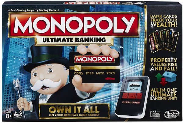 Introducing a modern banking version of the Monopoly game: the Ultimate Banking Edition. In this edition, Monopoly money is no more! The Monopoly Ultimate Banking game features an all-in-one Ultimate Banking unit with touch technology that makes the game fast and fun. Now players can instantly buy properties, set rent, and tap their way to fortune. Each player gets a bankcard and the Ultimate Banking unit keeps track of everyone's fortunes. It also scans the game's property cards and can boost or crash the market. Traditional Monopoly play gets amped up with this edition -- the game introduces Event cards and Location spaces instead of Chance cards and Community Chest cards. Land on an Event Space, and rents may be raised or lowered, a player may earn or lose money, or someone could get sent to Jail. Location Spaces allow players to pay and move to any property space on the gameboard. Challenge friends and family to win it all with the Monopoly Ultimate Banking game!