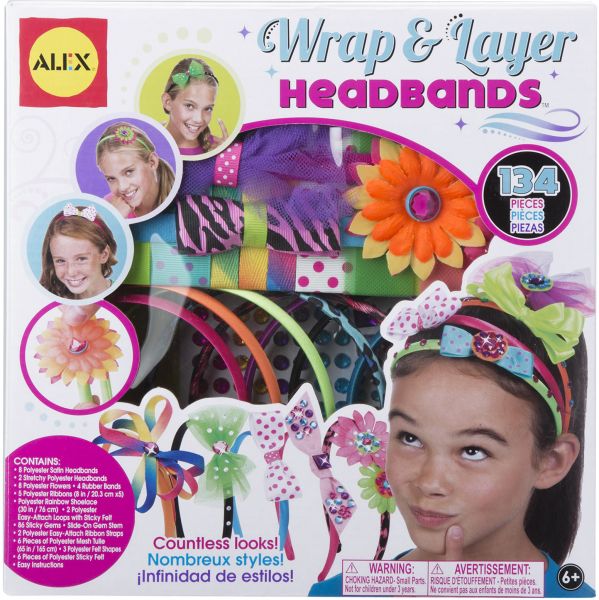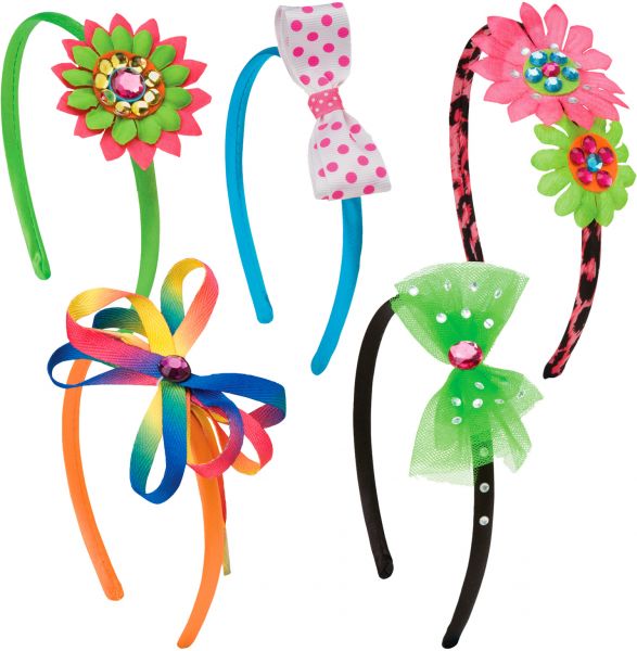- Includes 8 satin and stretchy headbands, ribbons, fabric flowers, shoelace, gem stem, ribbon straps, loops, tulle, sticky gems, felt and rubber bands