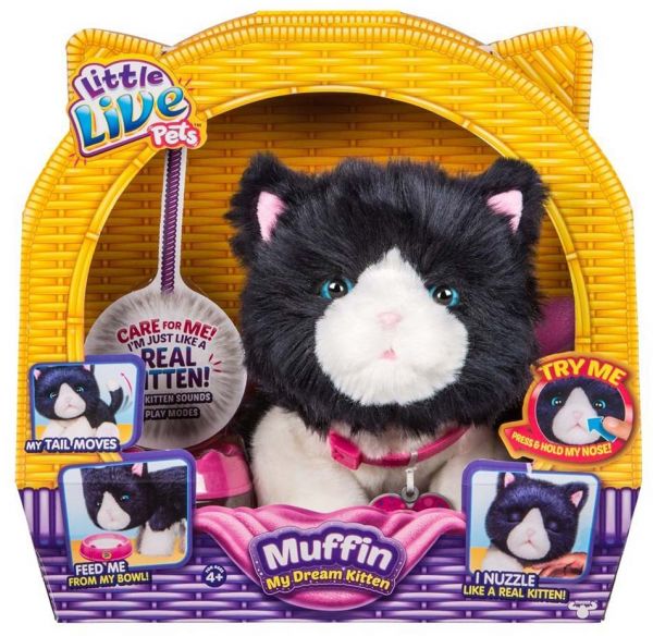 Say hello to Muffin, My Dream Kitten! The adorable Little Live Pet who moves and acts just like a real kitten! I purr when I'm happy. Scratch my cheek and I'll cuddle you! My tail moves just like a real kitten. My Dream Kitten make the perfect first pet for your child. They will fall in love with it the minute your kitten opens its eyes! This kitten is so lifelike they will truly connect as your child learns to nurture and care for their new pet! My Dream Kitten even comes with an adoption certificate so that they can truly make him their own.
