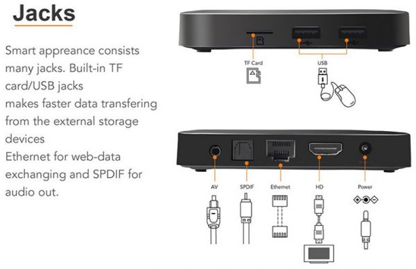 Interface: DC Power Port, Ethernet, HDMI, SPDIF, TF card, USB2.0