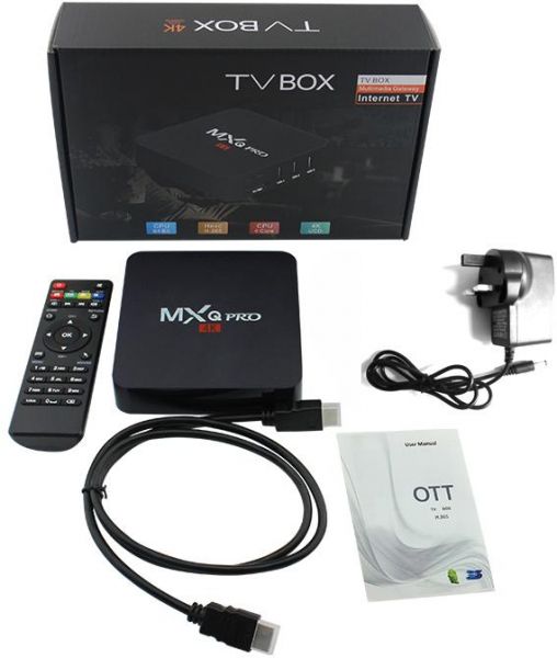 DESCRIPTION MXQ PRO 4K IS A SMART STREAMING MEDIA PLAYER WITH ANDROID 5.1 OS, SPECIFICATIONS: COLOR: BLACK OPERATING SYSTEM: ANDROID 5.1 CPU: 64Bit 4 Core RAM: 1GB DDR3 ROM: 8GB Hevc H.265, KODI,4K UCD, WIFI CONNECTIVITY: IEEE 802.11B/G/N, 10/100M LAN ETHERNET: 10/100M LANGUAGE: ENGLISH/FRENCH/GERMAN/SPANISH/ITALIAN/ ETC MULTILATERAL LANGUAGES BLUETOOTH: Not Available CAMERA: Not Available HDMI PORT: STANDARD HDMI 2.0 OTHER INTERFACES: 4*USB, 1*HDMI, 1*RJ45, 1*SD CARD SLOT, 1*AV, 1*DC IN, 1*SPDIF PRE-INSTALLED APPS:KODI, FILE EXPLORER , GOOGLE SEARCH, GOOGLE MAPS, BROWSER, GALLERY, CLOCK, PLAY STORE , CALCULATOR, CALENDAR, VIDEO, EMAIL, GMAIL,YOUTUBE POWER: POWER SUPPLY DC 5V/2A PACKAGE CONTENTS: 1 X TV BOX 1 X IR REMOTE CONTROL 1 X HDMI CABLE 1 X POWER ADAPTER 1 X USER MANUAL Brand : MXQ Type : Broadcast Internet & Multimedia