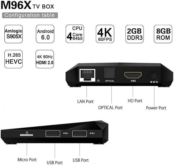 CHIPSET AMLOGIC S905XQUAD-CORE ARM CORTEX-A53 64 BITS IT PROVIDES EXPERIENCE TO ENJOY 4K ULTIMATE HD YOU CAN WATCH VIDEOS IN DETAIL LIKE NEVER BEFORE WITH SELECT HDR CONTENT. WITNESS SCENES AND CHARACTERS COME TO LIFE IN VIVID CONTRAST, COLOR, AND CLARITY BUILT-IN STANDARD RJ45 PORTA LARGE NUMBER OF APPLICATIONS ARE PRE-INSTALLED, SUCH AS NETFLIX, KODI, BROWSE, PLAY MUSIC, PLAY STORE, MIRACAST, MOVIE PLAYER ETC