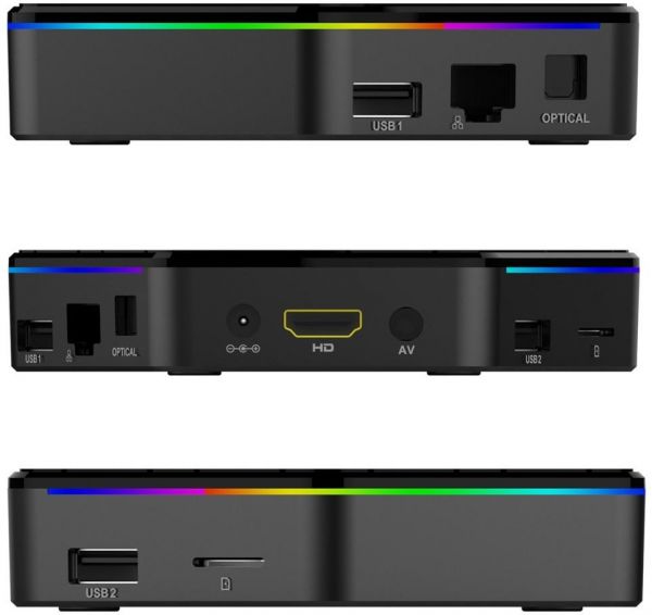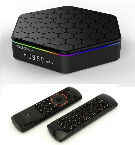 The T95Z Plus is certainly not your standard boring TV Box. Having a hexagonal shape and honeycomb patterned top this mini TV box with its cool LED lights certainly stands out from the crowded market. Coming with a comprehensive remote control that includes 4 buttons for use in conjunction with your TV it's a super little media player with a unique and stylish design. Once powered on a front LCD display brings up the time and the remote will even let you scroll through the LED colours so you can draw attention to this stylish new addition to your home that will light up with cyan, blue or green lighting if you wish.