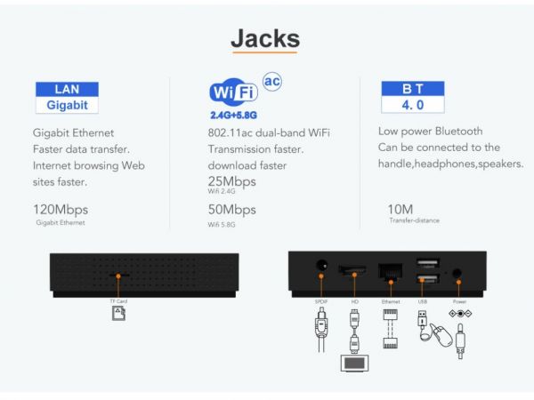 Interface: DC Power Port,Ethernet,HDMI,SPDIF,TF card,USB2.0