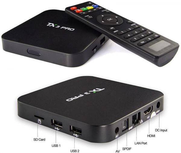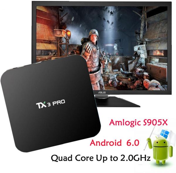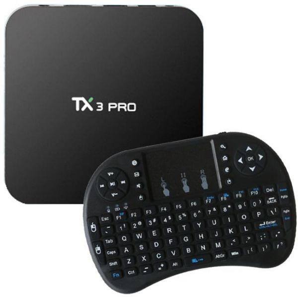 Description: The powerful Amlogic S905X Quad-core ARM Cortex-A53 processor with the Penta-core ARM Mali-450 graphics engine provides stellar performance for high definition video playback. Main Features: 1. XMBC supported: XMBC can be used to play almost all popular audio and video formats. 2. Android 6.0: It has cross App functionality which can meet the higher demands for users. 3. 4K H.265 owns a high performance and shows the super HD video effects via the same bandwidth. 4. Two USB host ports: Connect with your mouse and keyboard to help you operate more convenient. 5. It supports the 3D games playing and 1080P online chat. 6. Built-in varieties of applications. Specifications: 1. Model: TX3 Pro 2. Type: TV Box 3. GPU: Mali-450 4. System: Android 6.0 5. CPU: Amlogic S905X 6. Core: 2.0 GHz, Cortex A5, Quad Core 7. RAM: 1G 8. ROM: 8G 9. Max Extended Capacity: TF card up to 32GB (not included) 10. Colour: Black 11. Decoder Format: H.265 12. Video format: 4K x 2K, H.264, H.265, MPEG-1, MPEG-4, VC-1, VP9 Profile-2, WMV 13. Audio format: AAC, APE, FLAC, M4A, MP3, WAV, WMA 14. Photo Format: BMP, GIF, JPEG, JPG, PNG 15. Power Supply: Charge Adapter 16. Interface: AV, DC Power Port, HDMI, RJ45, SPDIF, TF card, USB2.0 17. Language: Multi-language 18. WiFi Chip: WiFi 2.4G 19. KODI Pre-installed: Yes 20. KODI Version: KODI 16.1 JARVIS 21. Power Type: External Power Adapter Mode 22. Package weight: 0.446 kg 23. Product size (L x W x H): 10.00 x 10.00 x 1.50 Package Contents: · 1 x TX3 Pro TV Box · 1 x Remote Control · 1 x Power Adapter · 1 x HDMI Cable · 1 x i8 Wireless Keyboard and Touch-Pad