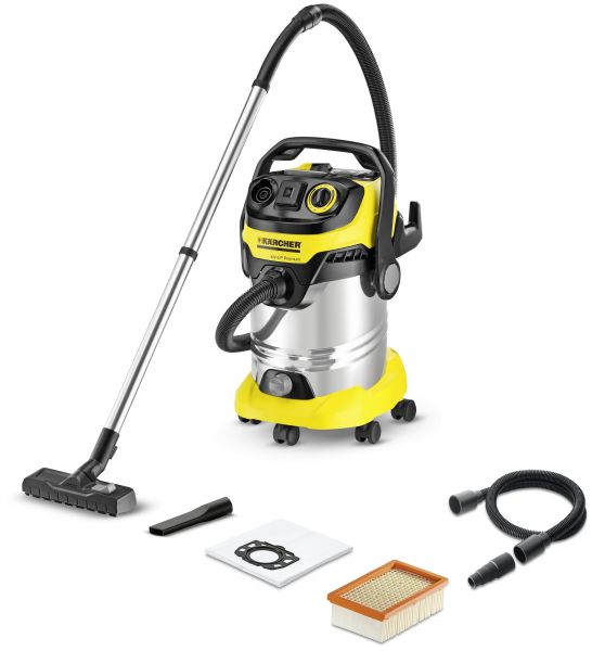 The high-end WD 6 P Premium multipurpose vacuum cleaner impresses with its extremely high suction performance of 2000 watts, with an actual power consumption of only 1300 watts. The vacuum cleaner is equipped with innovative filter removal technology, with the flat fold filter contained in a removable cartridge in the device head. By folding out this cartridge, the filter can be removed in seconds without any contact with dirt. Dry and wet dirt can be vacuumed without having to change the filter. Thanks to the integrated filter cleaning function, the dirty filter can be efficiently cleaned by pressing the clean-out button, quickly restoring the suction performance. The socket with automatic on/off switch allows you to work with connected power tools. Dirt resulting from planing, sawing or grinding work is vacuumed directly. The suction performance can be adapted to requirements, both for standard vacuuming operations and for use with power tools. Other highlights: 30-litre stainless steel container, newly developed accessories for the best cleaning results, removable handle with protection against static, drain screw for large water volumes, parking position and much more.