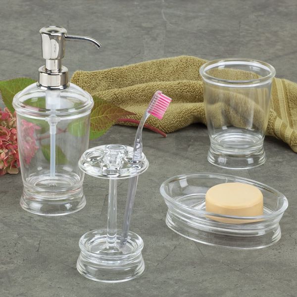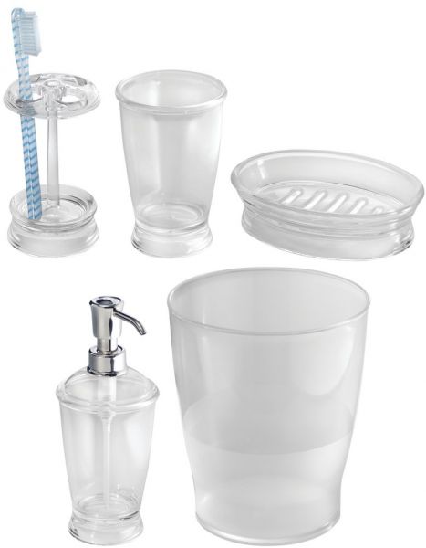 01259C5 Features: -Set includes12 oz. soap dispenser, toothbrush holder stand, tumbler, soap dish and trash can. -Made of durable plastic with rust-proof and plastic pump head. -Finish: Chrome and nickel. -Soap dish helps keep sinks and counter reside free. -Toothbrush holder stores 4 toothbrushes. -Franklin collection. Dimensions: -Soap Dispenser dimensions: 7.75" H X 3.5" W. -Toothbrush Holder dimensions: 5" H X 2.75" W. -Tumber dimensions: 4.25" H X 3.5" W. -Soap Dish dimensions: 7.75" W X 3.5" D.