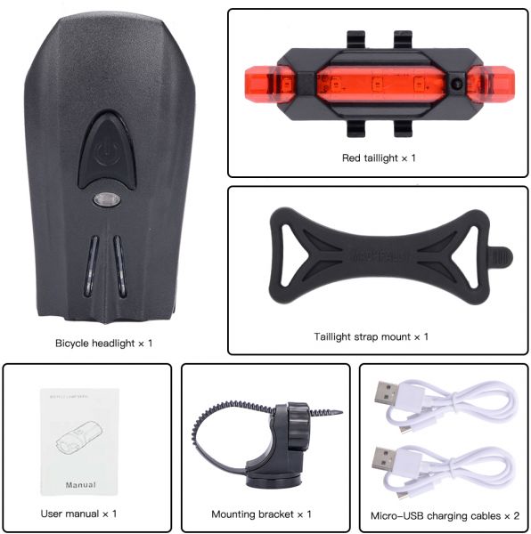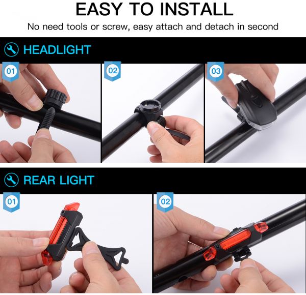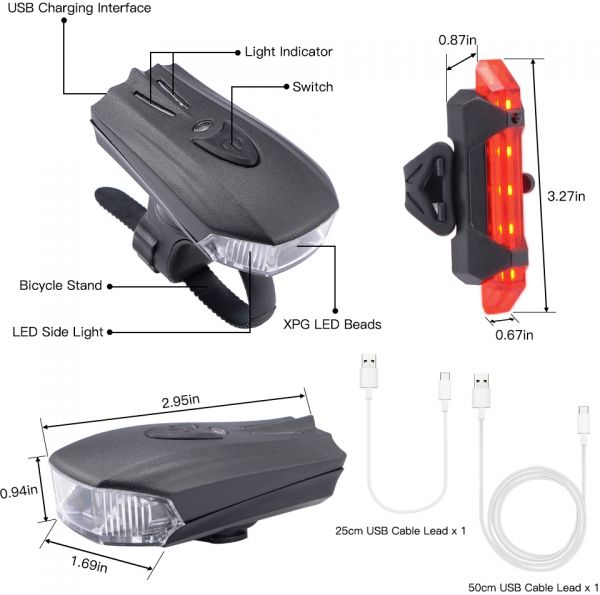 ✔SAVE YOUR MONEY AND HASSLE -Stop Wasting Your Money on batteries! Both the headlight and tail light are USB rechargeable. All you need is a USB cord (Two cords of different length included!) and a power source to recharge (Computer, laptop or a cellphone charger) At least 2 hours in STRONG mode, Light up your night.