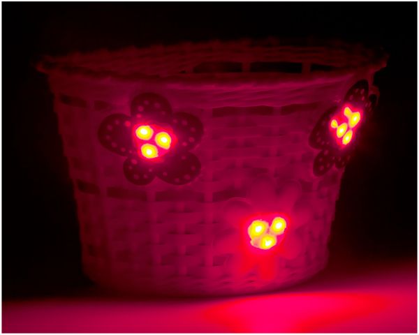 Your daughter will love bringing her favorite toys along for the right or picking up new treasures along the way with the Schwinn Girl's Basket, and it lights up for a little added fun and flare. Motion activated lighted flowers improves visibility in low-lit areas. Fits most bicycle handlebars. Bring small personal items along for the ride. Adjustable straps make assembly and removal a breeze.
