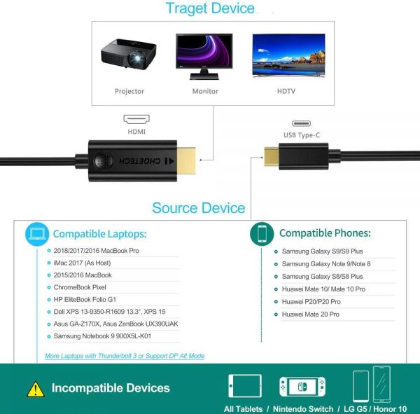 【Mirror MacBook Air & iPad Pro】All CHOETCH USB C to HDMI adapters and cables are fully compatible with MacBook Air 2018 and iPad Pro 2018. Just use this cable to run your bt sport app from your laptop to tv or mirror laptop's display on a monitor with an hdmi socket.