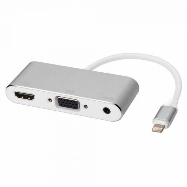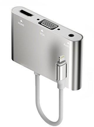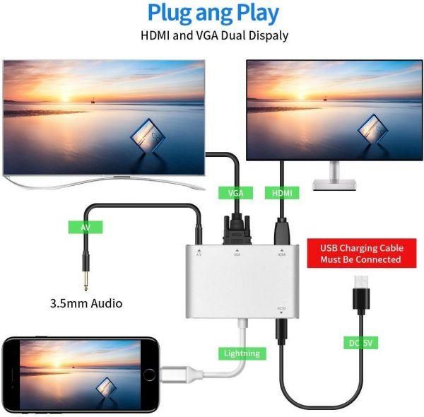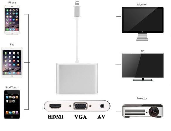 - To use, attach adapter to the Lightning connector on your device and then to your TV or projector via a VGA cable or an HDMI cable (Both HDMI & VGA cable are not included)