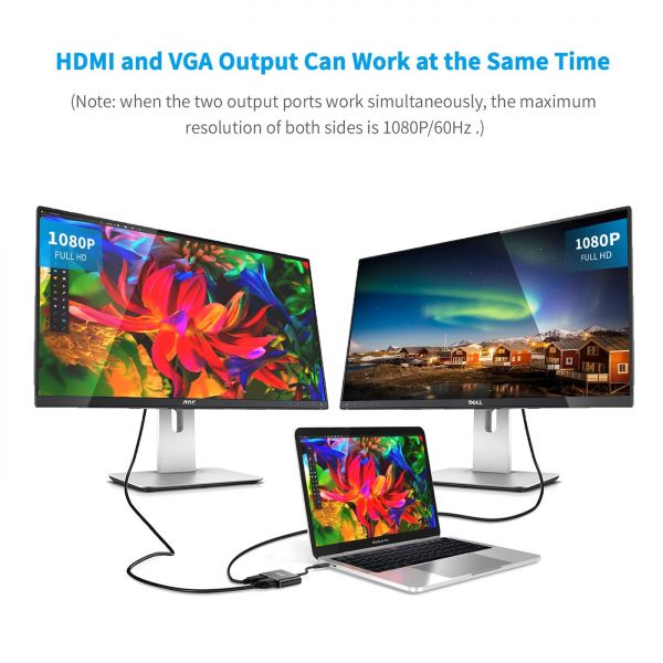 USB-C to HDMI+VGA adapter offers a plug and play solution for mirroring what display on your USB-C laptop to external TV/monitors/projectors.