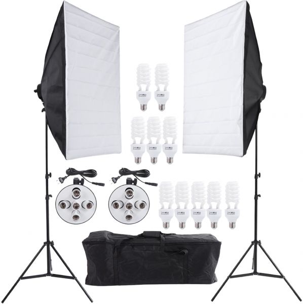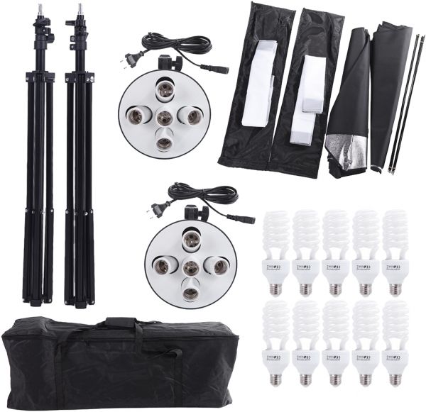 The Andoer lighting kit helps you set up the perfect environment for capturing high-quality photos. This kit comprises two softbox, two 5-in-1 light holder, ten bulbs, two light stands and one carrying bag. The softbox gets rid of the shadow and provides a soft light stream to beautify a photo. It is convenient to use at a stretch, thanks to its temperature resistance ability. Furthermore, the softbox features high-quality flash cloth that disperses maximum light. The 45W bulbs offer a bright environment for capturing photos. The color temperature of 5500K gives you perfect bright light that enhances the quality of a captured image.
