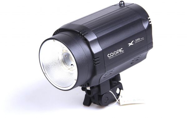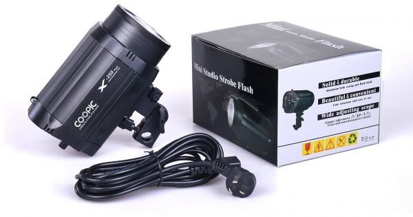 SPECIFICATIONS: This series of Mini studio strobe adopt stepless adjustment (1/32~1/1),up to six levels output control, fast recycling speed .It is perfect light source for hair-style, background, digital camera and so on; you can not only use the strobe flash personally, but also use the modeling light together with the strobe flash . At the same time, many accessories can match it, such as soft box , reflector umbrella, etc, so as to make the light source changeable, come out much perfect light source.Technical parameters:Model: COOPIC X-250 mini studio flashGN: 43Power variation: Stepless adjustment (1/32 ~ 1/1)Recycling time: 0.5~3SModeling bulb: 50WSensor distance: ≥15MColor temperature: 5500K ± 200KTriggering voltage: DC-5VFuse: 5AFunctions and descriptionA. POWER- Power switch. Press it upwards and the power indicator will be on, which indicates that the power source is connected and the strobe begins to charge.B. MODEL-Modeling light switch. Press it upwards, modeling light is on; press it on middle position, modeling light is off; press it downwards, modeling light is full output.C. SYNC- Sync socket(Φ3.5). Plug sync cable or remote trigger(Φ3.5), so as to realize sync control and remote control.D. Output Adjustment Knob. Rotate it towards clockwise to the end, full output Rotate it towards anti-clockwise to the end, mini output(1/32).Warning Must turn off the power source firstly(pull the power cable out of the socket), then start to change the accessories of the light body and maintain or clean the equipment.1. Please use the power supply with good earth connection and make sure power source off when it is not used.2. It is a normal phenomenon when the lamp body becomes hot. Do not flash continuously if without any special needs.3. Please use excellent and high quality overheating-resistant components (such as soft box, snoot, etc).4. Do not use it in a damp, frigid or high temperature environment.5. This equipment contains high value storage capacitors that can be lethal to touch, authorized persons shouldn't dismantle, repair or modify this equipment.6. Do not touch or directly stare at the flash tube, keep children from playing the unit.7. Products shall be overhauled by professional staff before using when the products are in trouble or got wet.Package includes:COOPIC Mini studio flash X-250--------1pc