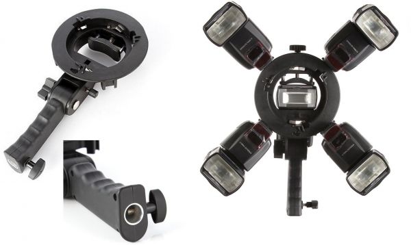 Upgraded version designed with 4 independent cold shoe around the side to combine 5 units of speedlites / flashes together. Greatly increasing light intensity