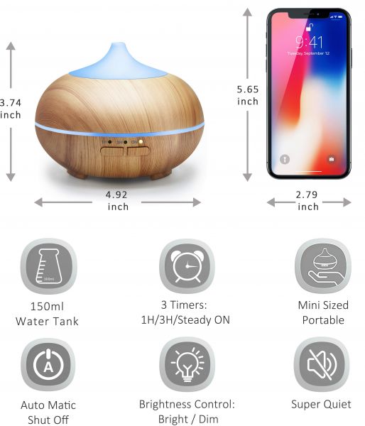 描述:- 5-IN-1 AROMATHERAPY DEVICE: This ultrasonic essential oil diffuser is an amazing multifunction aromatherapy device unlike any other you've ever used. It features a easy to clean 150ml water tank, 7 different LED light colors, multiple mist nebulizer modes, as well as a safety auto-switch that prevents it from overheating in case it runs out of water.