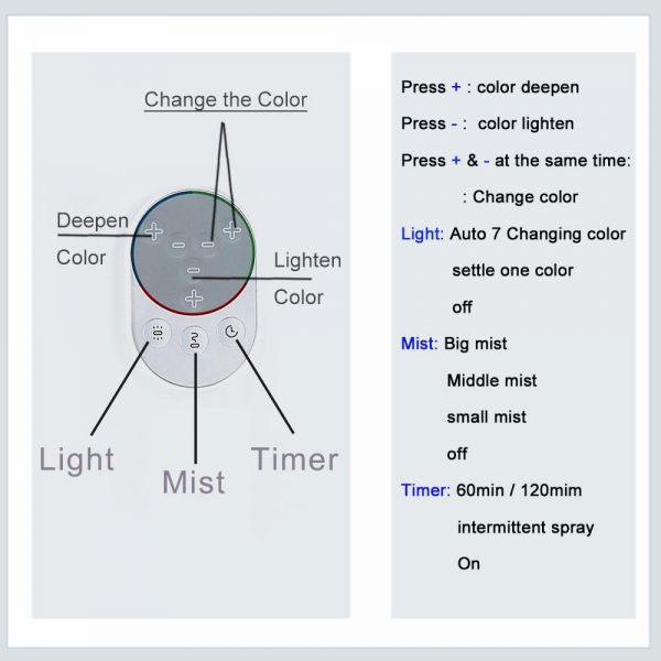 描述:- Convenient IR control remote diffuser; which can modify mist, change between 7 rainbow led colors, adjust operation time 60 or 120 mins. In other words, an effortless diffuser.