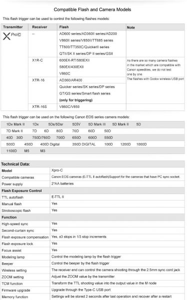 Fully support TTL autoflash, 1/8000s high-speed sync, multi flash, manual flash, flash exposure compensation, TCM transform function, magnification function, one shoot and multi-shoot setting, group modeling lamp control, group zooming, adjusting all groups' output value simultaneously, etc.