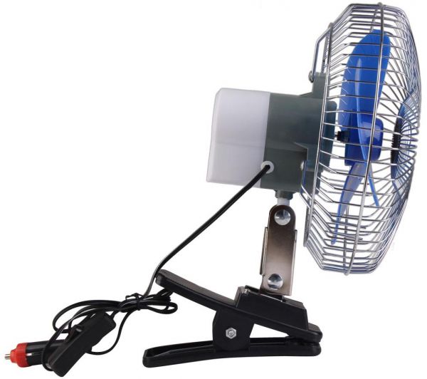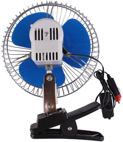 12V Oscillating Car Fan, Full safety metal guard The oscillating motion of the fan allows the air to be circulated throughout your whole car. The 12V Oscillating Auto Fan plugs right into your car's cigarette lighter so you don't need any extra batteries. This fan is ideal for cars, trucks, buses, off road equipment, boats and other recreational vehicles. Works off your car accessory outlet, and provides cool relief on even the hottest days. This item includes a cigarette lighter plug. Material: Metal, superior plastic Operated by 12V DC 25W Dimension: 8 inch Fan Diameter: approximately 22cm Color: As shown