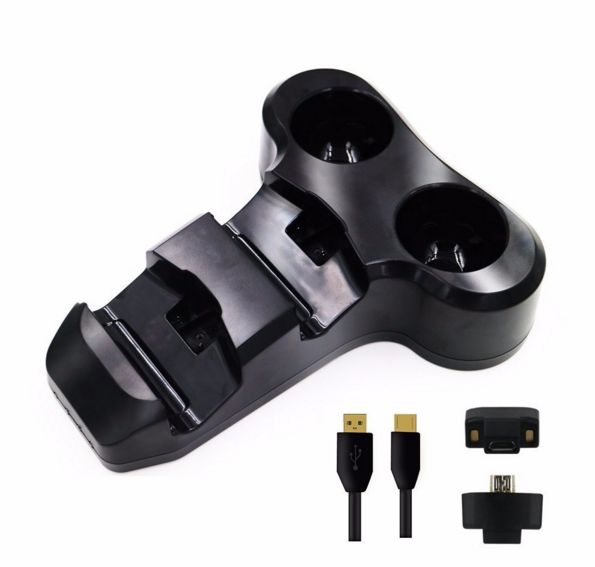 Specifications: Material: ABS Input voltage: DC 5V Color: Black 4. Compatible with: PS4 , PS MOVE Full charge to 2 controllers simultaneously within 5 hours. Compatible Controllers: PS MOVE Controller and PS4 Controller What you get:1x PS4 Charging Dock 1x Charging Cable 2x Dongles 1x Manual