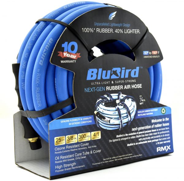 BluBird is the evolution of general purpose hoses as we know them. A conflation of technology and market experience, the BluBird hoses are tailor made with the end-users in mind. Offering the best of all words - the cold weather flexibility, strength and durability of the best rubber hoses and the light-weight and ease of hybrid hoses, BluBird is the ultimate hose package that comes with a 10 year warranty and at an unbeatable price. Hose Inner Diameter: 3/8"; Hose Length: 25' Max. Working Pressure: 300PSI Safety Factor: 4:1