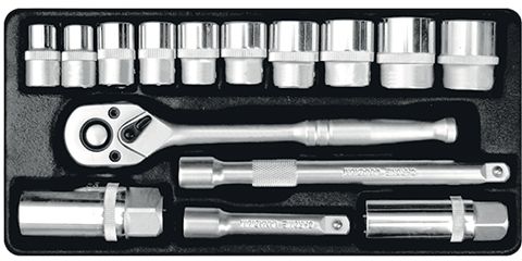 - Set Includes: 10 x Sockets 10 / 11 / 12 / 13 / 14 / 15 / 17 / 19 / 21 / 22 mm, 2 x Spark plug socket 16 & 21 mm, 2 x extension bar 75 & 150 mm, 1 x 45T ratchet 3 / 8 inch, Chrome vanadium