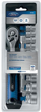 - Set Includes: 10 x Sockets 10 / 11 / 12 / 13 / 14 / 15 / 17 / 19 / 22 / 24 mm, 1 x Extension bar 150 mm, 1 x 72T ratchet 3 / 8 inch, Chrome vanadium