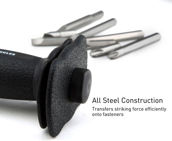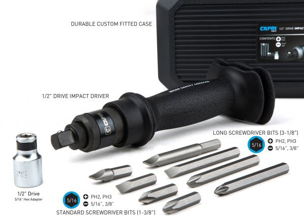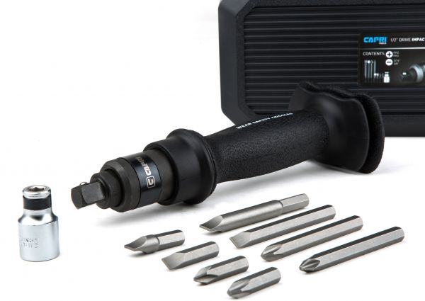 The Capri Tools 1/2 in. Drive Impact Screwdriver Set with Bits helps you turn simple hammer strikes into a powerful and consistent force to securely tighten or quickly loosen stubborn nuts and bolts. It features dual direction: one for tightening and the other for loosening. Simply select the direction to loosen or tighten, and use a hammer to strike the impact screwdriver to easily loosen or tighten the fastener. A solid, all steel go-through shaft construction transfers striking force efficiently onto the fastener. Double-layer hand protection protects your hand from hammer strikes. Ergonomic slip-resistant handle is easy to hold securely. It is compatible with 1/2 in. hex drive sockets and bits as well as 5/16 in. hex bits by using the included adapter. Set includes the impact screwdriver, an 1/2 to 5/16 in. hex adapter, and 8 screwdriver bits: Slotted: 5/16 x 1-3/8, 3/8 x 1-3/8, 5/16 x 3-1/8, 3/8 x 3-1/8 in., Phillips: PH2 x 1-3/8, PH3 x 1-3/8, PH2 x 3-1/8, PH3 x 3-1/8 in. The impact screwdriver is perfect for applications such as replacing brake calipers where fasteners require extra force to loosen and properly tighten.