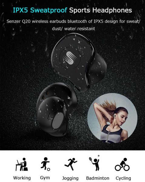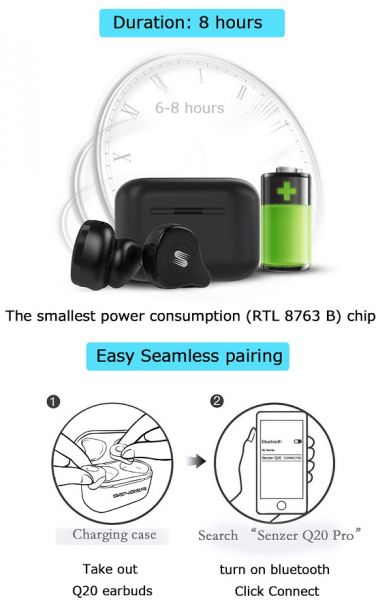[Hi-Res Standard Stereo Sound]:Senzer Q20 with upgraded bluetooth 5.0 chipsets (Realtek RTL8763B) for high transmission of audio, to deliver high fidelity stereo sound with low latency. The 14mm customized speakers and special acoustic chamber structure on wireless earphones offer a clear mid-range and balanced bass and treble performance.