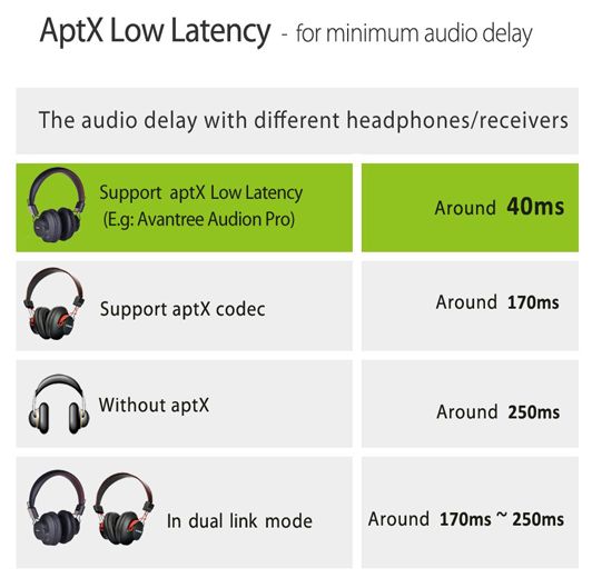 - Audio bandwidth matching CD performance; aptX low latency technology effectively removing Bluetooth transmission delays. Real audio and video synchronization.