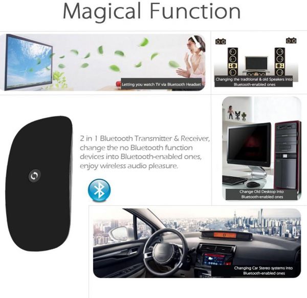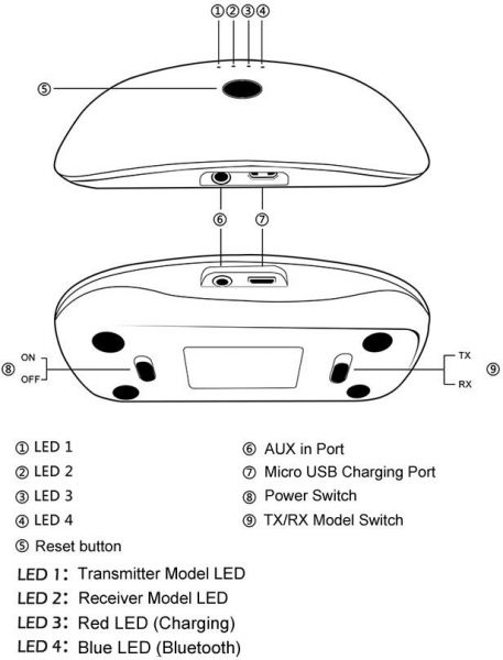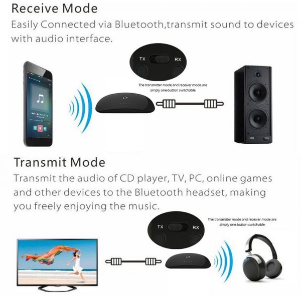 SpecificationsBluetooth Version: V4.0+EDRSupported Profiles: A2DP,AVRCPBluetooth Range: Within 33ft (10m)Dimensions: 112.7*57.5*22.5mmBattery: Rechargeable Lithium-ion battery 300 mAhCharging Time: 5V About 2 hoursWorking Time: Up to 6 hoursStand-by Time: Up to 300 hoursTransmitter ModelMake sure the switch under TX mode.Use the audio cable connect this product to the TV or others devices.Open your Bluetooth headsets or speakers (under Bluetooth model).This product will auto-connect your Bluetooth headsets or speakers, then the TV or others devices sound will transmitter into your Bluetooth headsets or speakers after pairing successful. Note:The transmitter searching time will last about 20 seconds, if your devices not be paired successful after 20 seconds, please press the reset button to try again. Receiver ModelMake sure the switch under RX model.Use the audio cable connect this product to the normal speaker.Use cellphone to search and connect.One with two: close first cellphone Bluetooth, then use second cellphone connect the receiver like previously, at the same time you can open the previous cellphone to connect this receiver. Note:The receiver pairing time will last about 2 minutes, if your cellphones no pairing successful after 2 minutes, please press the reset button to try again.LED Status Pairing: Blue LED flashingPaired Successful: Blue LED solidPower Low: Red LED flashingCharging: Red LED solidFull Charged: Red LED turn offIncluded:2 in 1 transmitter & receiverUSB Micro Charging Cable3.5mm Audio CableUser Manual