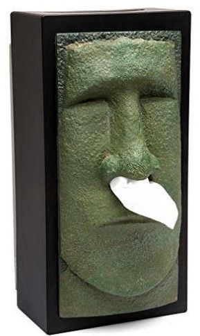 For the person who has everything, they probably don't have Rudy, the Tikihead tissue box holder! The Easter Island-style face is a antiqued green attached on top.